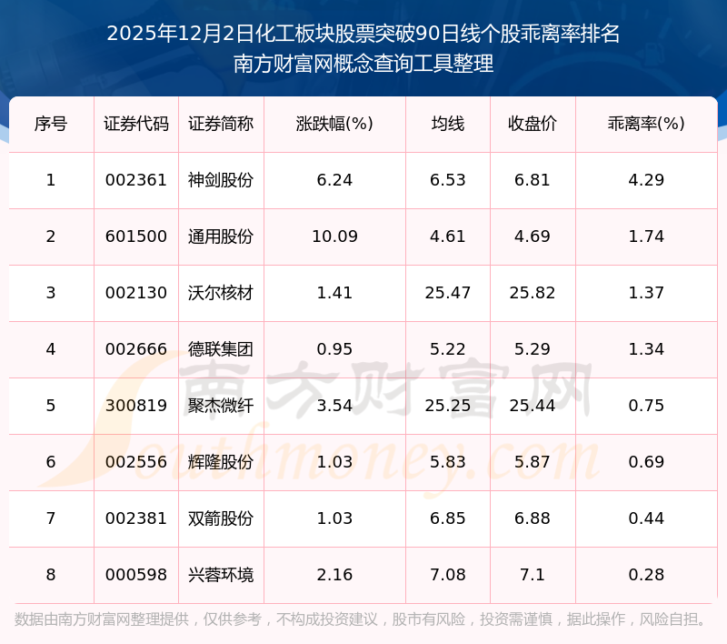 根据南方财富网概念查询工具数据统计,截止2025年12月2日收盘,化工板块股票共有8只个股收盘价向上突破了90日线。其中乖离率较大的个股有神剑股份、通用股份、沃尔核材等,乖离率分别为4.29%、1.74%、1.37%。