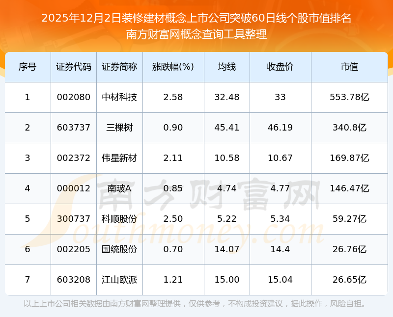 根据南方财富网概念查询工具数据统计,截止2025年12月2日收盘,装修建材概念上市公司共有7只个股收盘价向上突破了60日线。其中市值较大的个股有中材科技、三棵树、伟星新材等,市值分别为553.78亿、340.8亿、169.87亿。