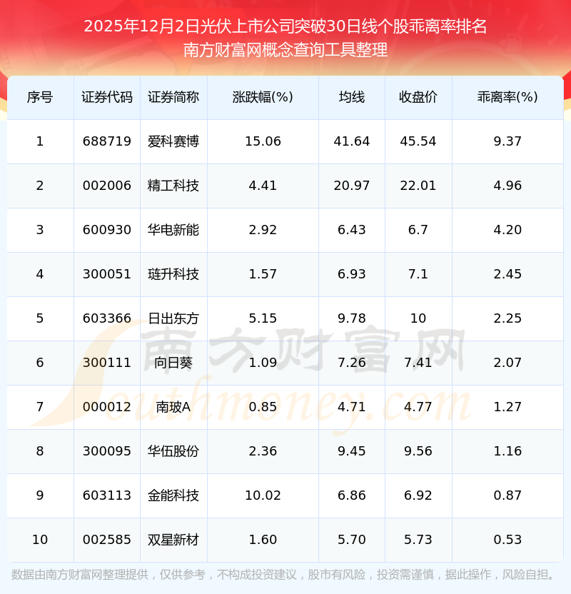 根据南方财富网概念查询工具数据统计,截止2025年12月2日收盘,光伏上市公司共有11只个股收盘价向上突破了30日线。其中乖离率较大的个股有爱科赛博、精工科技、华电新能等,乖离率分别为9.37%、4.96%、4.20%。