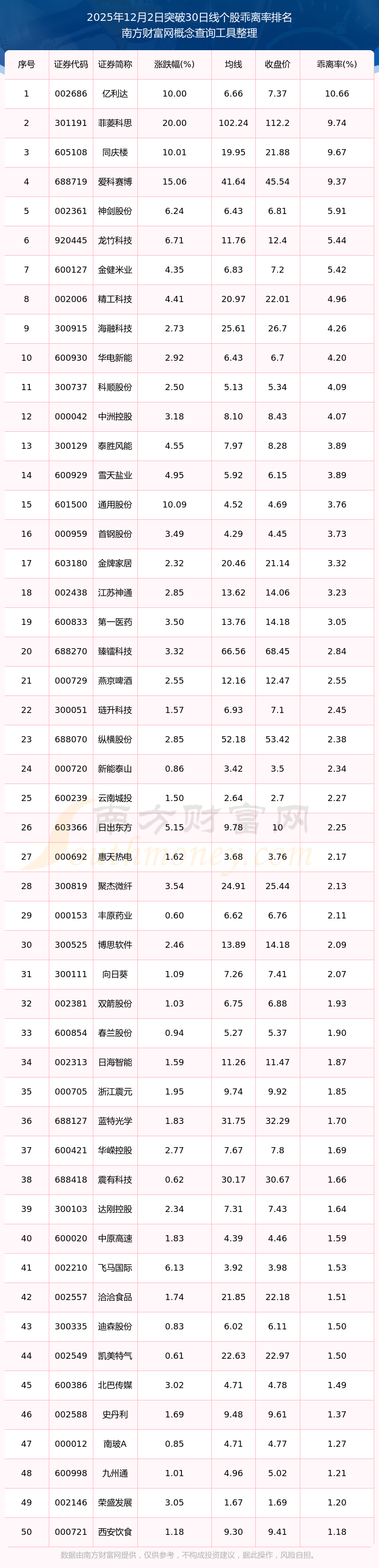 根据南方财富网概念查询工具数据统计,截止2025年12月2日收盘,共有84只个股收盘价向上突破了30日线,其中乖离率较大的个股有亿利达、菲菱科思、同庆楼、爱科赛博、神剑股份等,乖离率分别为10.66%、9.74%、9.67%、9.37%、5.91%。