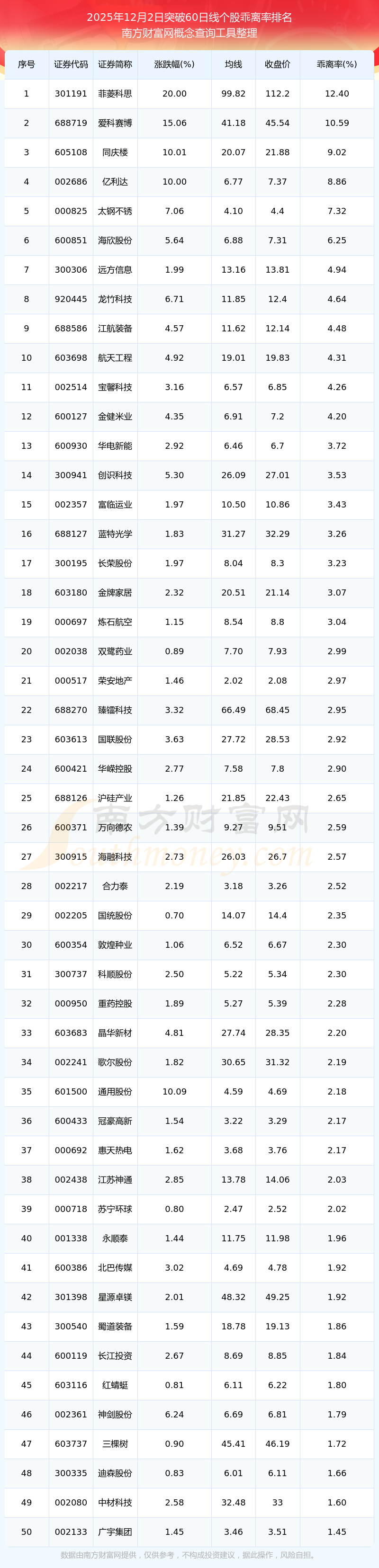 根据南方财富网概念查询工具数据统计,截止2025年12月2日收盘,共有96只个股收盘价向上突破了60日线,其中乖离率较大的个股有菲菱科思、爱科赛博、同庆楼、亿利达、太钢不锈等,乖离率分别为12.40%、10.59%、9.02%、8.86%、7.32%。