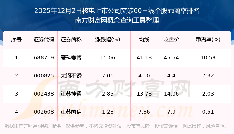 2025年12月2日核电上市公司突破60日线个股乖离率排名