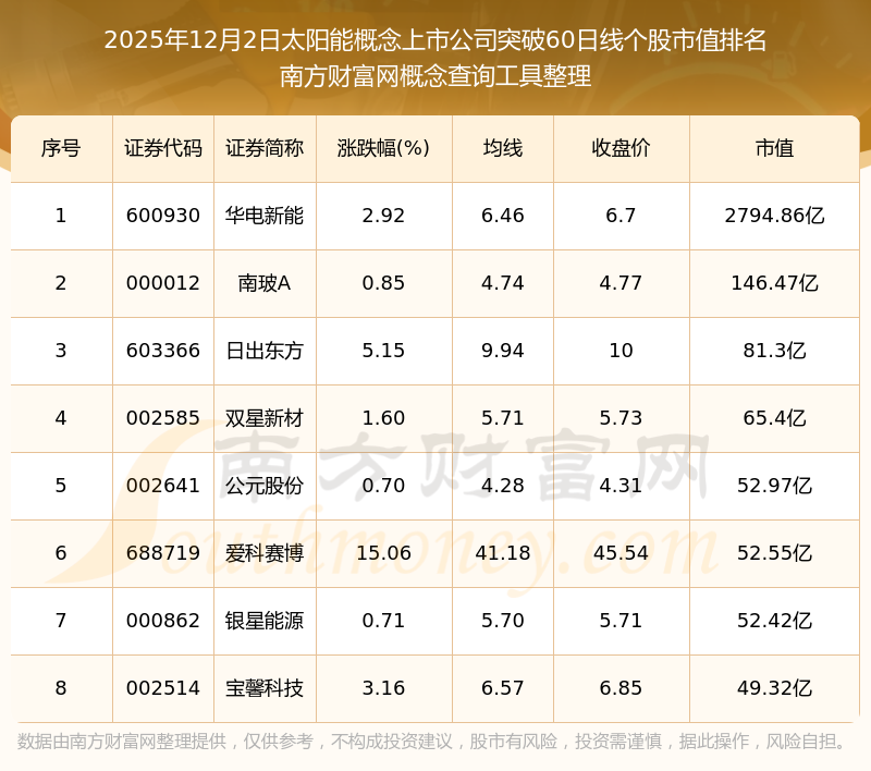 根据南方财富网概念查询工具数据统计,截止2025年12月2日收盘,太阳能概念上市公司共有8只个股收盘价向上突破了60日线。其中市值较大的个股有华电新能、南玻A、日出东方等,市值分别为2794.86亿、146.47亿、81.3亿。