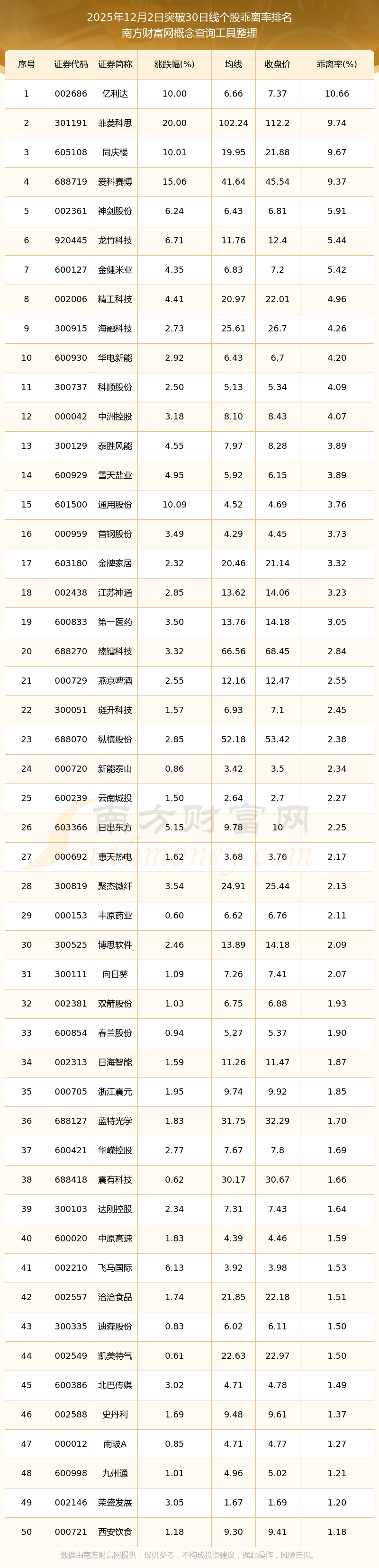 2025年12月2日突破30日线个股乖离率排名