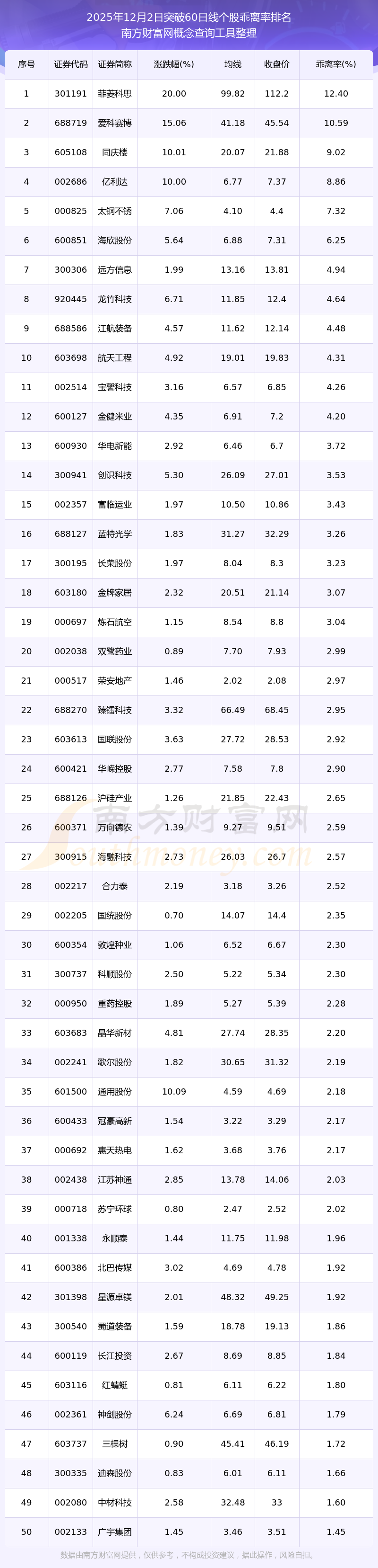 根据南方财富网概念查询工具数据统计,截止2025年12月2日收盘,共有96只个股收盘价向上突破了60日线,其中乖离率较大的个股有菲菱科思、爱科赛博、同庆楼、亿利达、太钢不锈等,乖离率分别为12.40%、10.59%、9.02%、8.86%、7.32%。