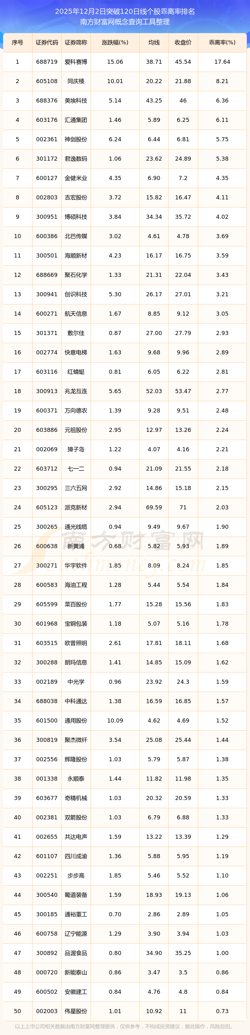 根据南方财富网概念查询工具数据统计,截止2025年12月2日收盘,共有67只个股收盘价向上突破了半年线,其中乖离率较大的个股有爱科赛博、同庆楼、美埃科技、汇通集团、神剑股份等,乖离率分别为17.64%、8.21%、6.36%、6.11%、5.75%。