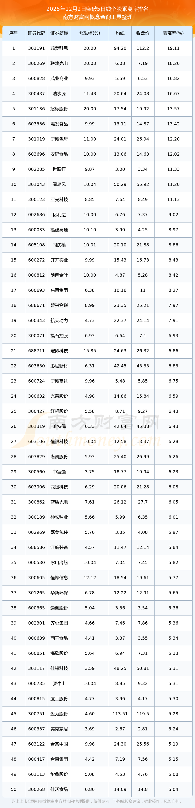 根据南方财富网概念查询工具数据统计,截止2025年12月2日收盘,共有317只个股收盘价向上突破了5日线,其中乖离率较大的个股有菲菱科思、联建光电、茂业商业、清水源、招标股份等,乖离率分别为19.11%、18.26%、16.82%、16.67%、13.57%。