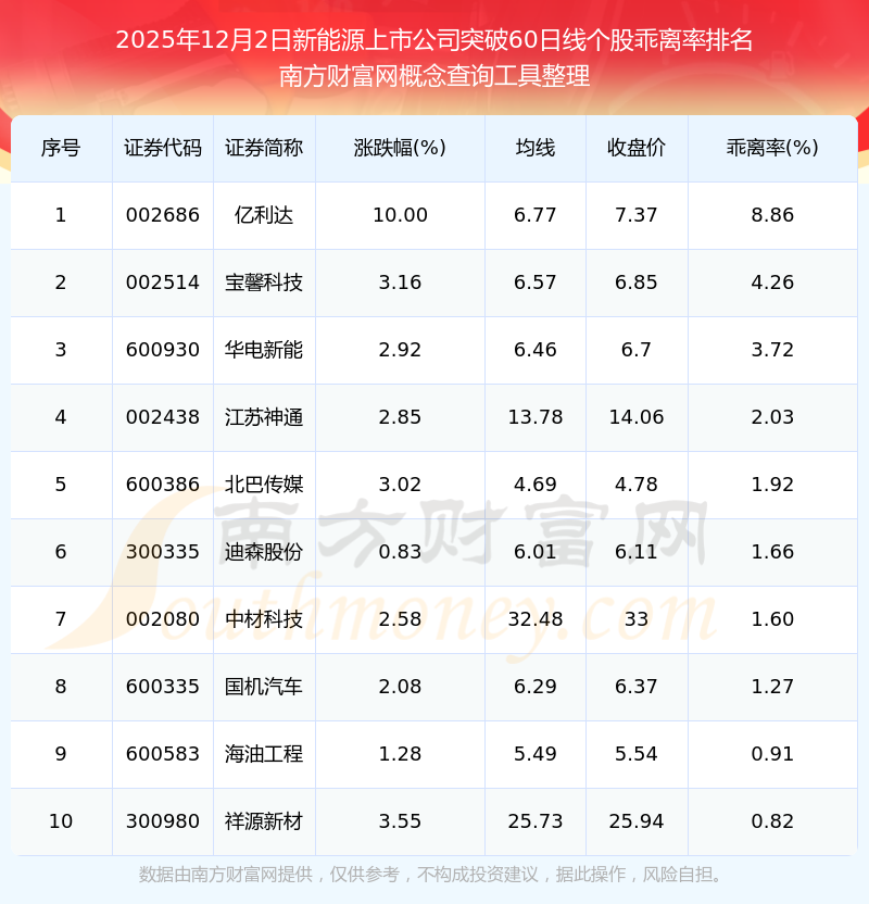 根据南方财富网概念查询工具数据统计,截止2025年12月2日收盘,新能源上市公司共有17只个股收盘价向上突破了60日线。其中乖离率较大的个股有亿利达、宝馨科技、华电新能等,乖离率分别为8.86%、4.26%、3.72%。