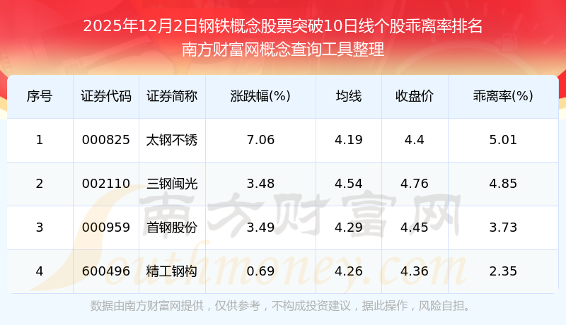 根据南方财富网概念查询工具数据统计,截止2025年12月2日收盘,钢铁概念股票共有4只个股收盘价向上突破了10日线。其中乖离率较大的个股有太钢不锈、三钢闽光、首钢股份等,乖离率分别为5.01%、4.85%、3.73%。