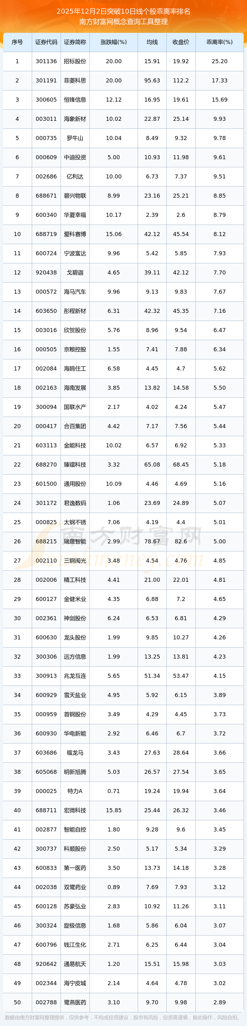 根据南方财富网概念查询工具数据统计,截止2025年12月2日收盘,共有194只个股收盘价向上突破了10日线,其中乖离率较大的个股有招标股份、菲菱科思、恒锋信息、海象新材、罗牛山等,乖离率分别为25.20%、17.33%、15.69%、9.93%、9.78%。
