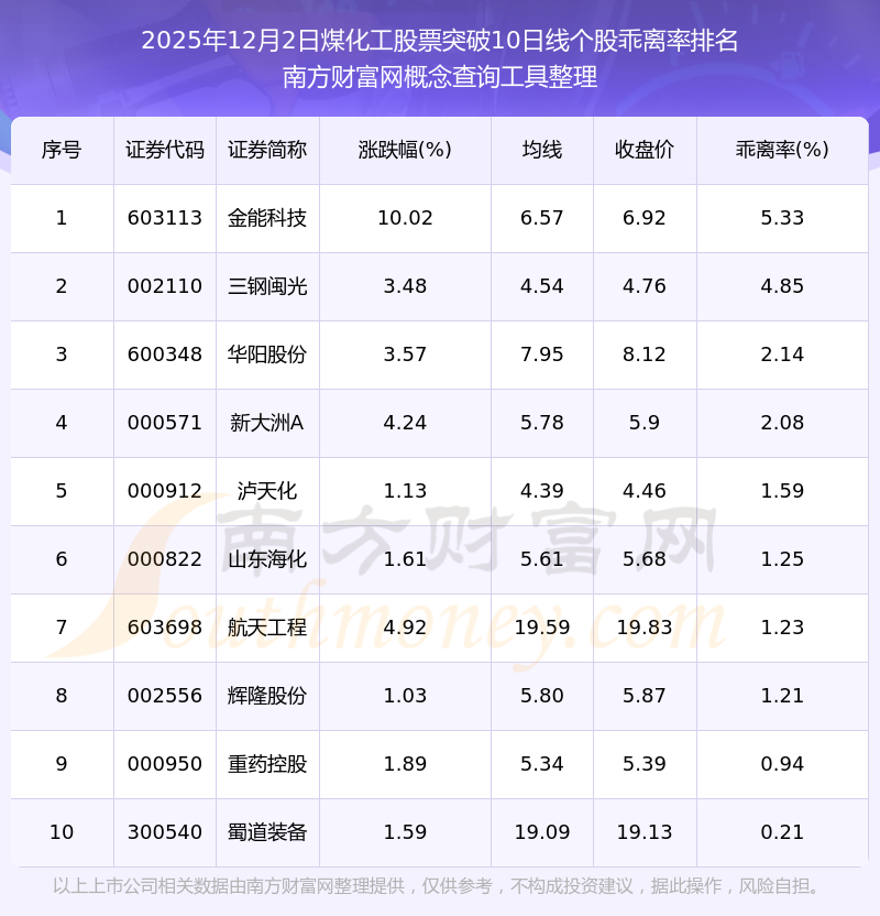 根据南方财富网概念查询工具数据统计,截止2025年12月2日收盘,煤化工股票共有10只个股收盘价向上突破了10日线。其中乖离率较大的个股有金能科技、三钢闽光、华阳股份等,乖离率分别为5.33%、4.85%、2.14%。