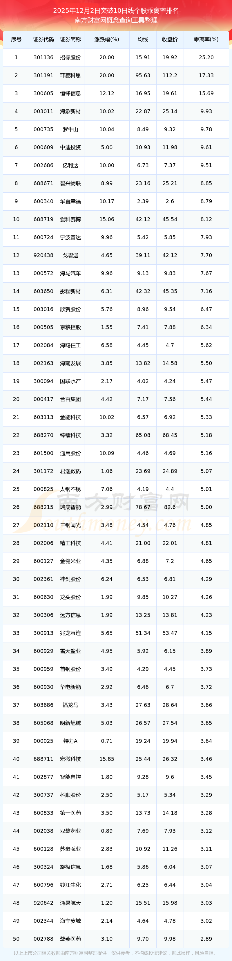 根据南方财富网概念查询工具数据统计,截止2025年12月2日收盘,共有194只个股收盘价向上突破了10日线,其中乖离率较大的个股有招标股份、菲菱科思、恒锋信息、海象新材、罗牛山等,乖离率分别为25.20%、17.33%、15.69%、9.93%、9.78%。