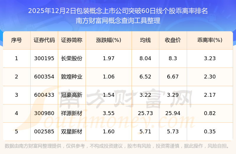 根据南方财富网概念查询工具数据统计,截止2025年12月2日收盘,包装概念上市公司共有5只个股收盘价向上突破了60日线。其中乖离率较大的个股有长荣股份、敦煌种业、冠豪高新等,乖离率分别为3.23%、2.30%、2.17%。