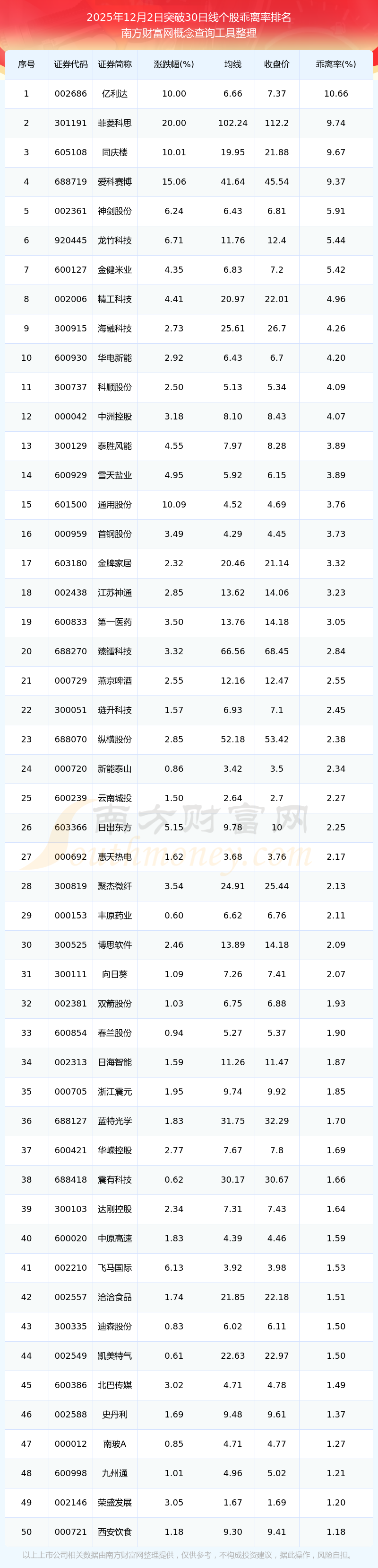 根据南方财富网概念查询工具数据统计,截止2025年12月2日收盘,共有84只个股收盘价向上突破了30日线,其中乖离率较大的个股有亿利达、菲菱科思、同庆楼、爱科赛博、神剑股份等,乖离率分别为10.66%、9.74%、9.67%、9.37%、5.91%。