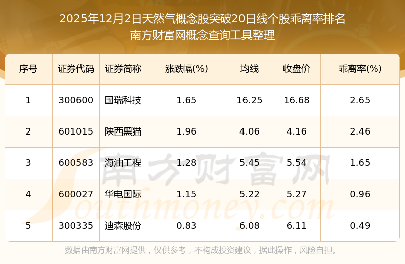 2025年12月2日天然气概念股突破20日线个股乖离率排名