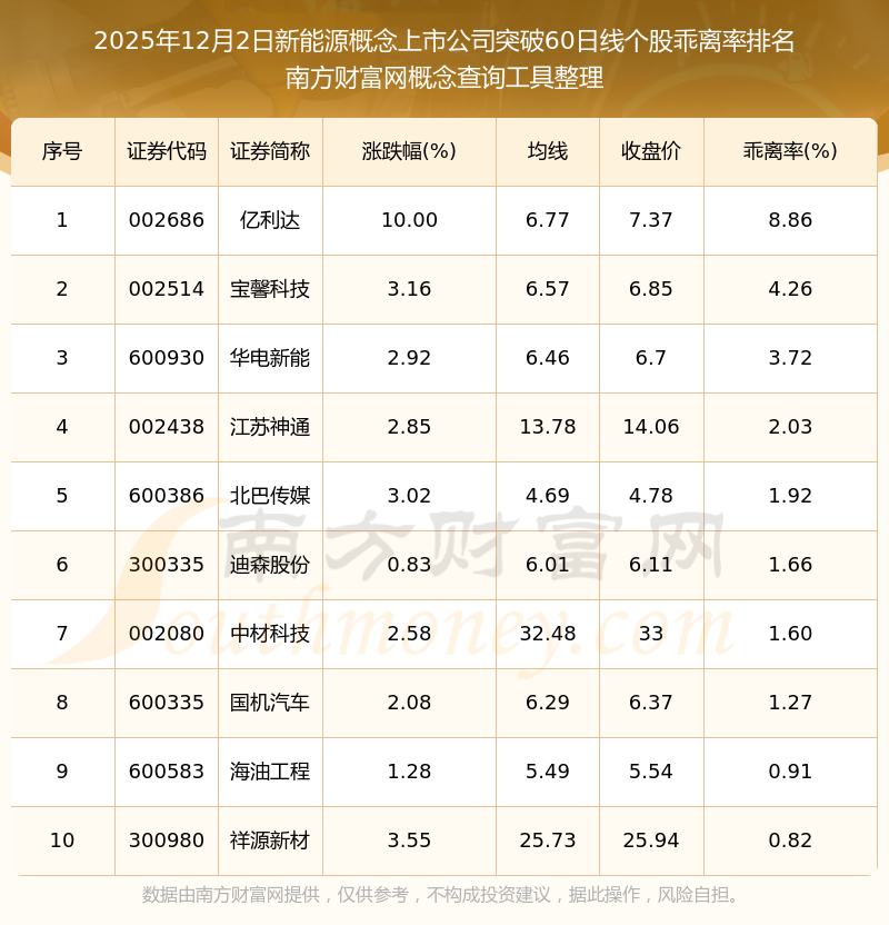 根据南方财富网概念查询工具数据统计,截止2025年12月2日收盘,新能源概念上市公司共有17只个股收盘价向上突破了60日线。其中乖离率较大的个股有亿利达、宝馨科技、华电新能等,乖离率分别为8.86%、4.26%、3.72%。