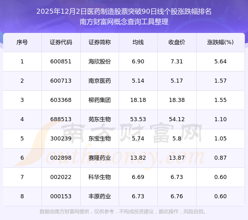 根据南方财富网概念查询工具数据统计,截止2025年12月2日收盘,医药制造股票共有8只个股收盘价向上突破了90日线。其中涨幅较大的个股有海欣股份、南京医药、柳药集团等,涨幅分别为5.64%、1.57%、1.55%。