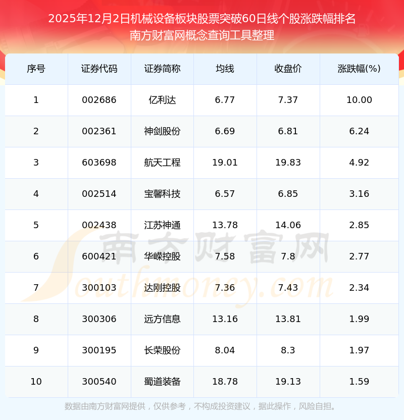 根据南方财富网概念查询工具数据统计,截止2025年12月2日收盘,机械设备板块股票共有12只个股收盘价向上突破了60日线。其中涨幅较大的个股有亿利达、神剑股份、航天工程等,涨幅分别为10.00%、6.24%、4.92%。