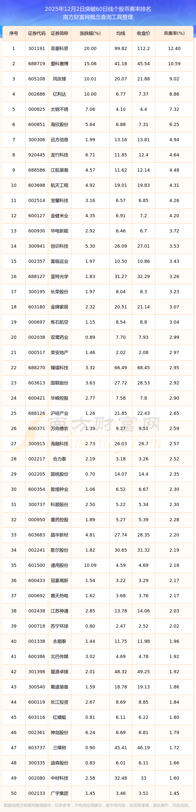 根据南方财富网概念查询工具数据统计,截止2025年12月2日收盘,共有96只个股收盘价向上突破了60日线,其中乖离率较大的个股有菲菱科思、爱科赛博、同庆楼、亿利达、太钢不锈等,乖离率分别为12.40%、10.59%、9.02%、8.86%、7.32%。