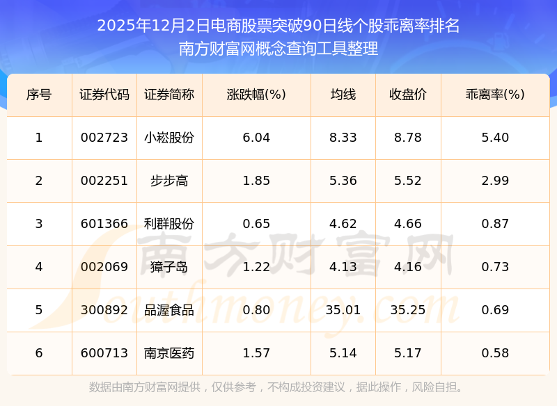 根据南方财富网概念查询工具数据统计,截止2025年12月2日收盘,电商股票共有6只个股收盘价向上突破了90日线。其中乖离率较大的个股有小崧股份、步步高、利群股份等,乖离率分别为5.40%、2.99%、0.87%。