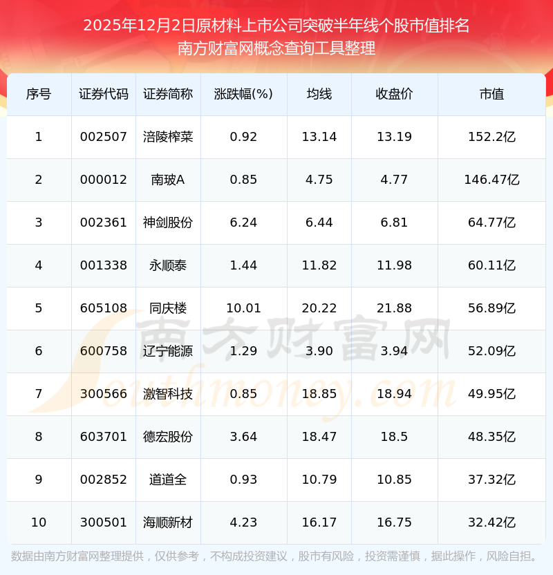 根据南方财富网概念查询工具数据统计,截止2025年12月2日收盘,原材料上市公司共有12只个股收盘价向上突破了半年线。其中市值较大的个股有涪陵榨菜、南玻A、神剑股份等,市值分别为152.2亿、146.47亿、64.77亿。