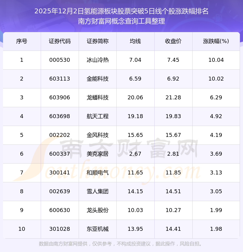 根据南方财富网概念查询工具数据统计,截止2025年12月2日收盘,氢能源板块股票共有17只个股收盘价向上突破了5日线。其中涨幅较大的个股有冰山冷热、金能科技、龙蟠科技等,涨幅分别为10.04%、10.02%、6.29%。