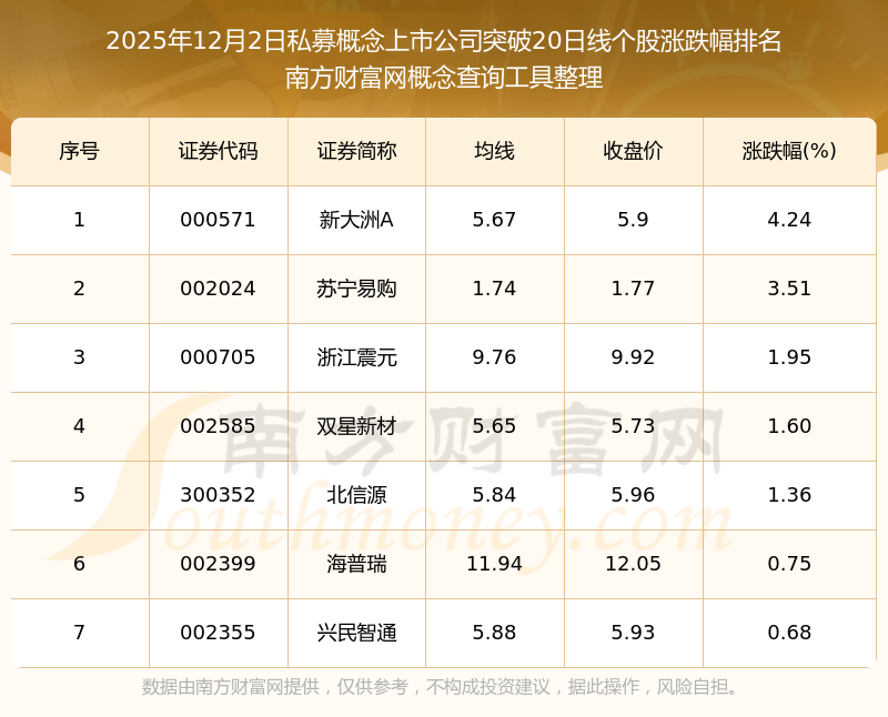 根据南方财富网概念查询工具数据统计,截止2025年12月2日收盘,私募概念上市公司共有7只个股收盘价向上突破了20日线。其中涨幅较大的个股有新大洲A、苏宁易购、浙江震元等,涨幅分别为4.24%、3.51%、1.95%。