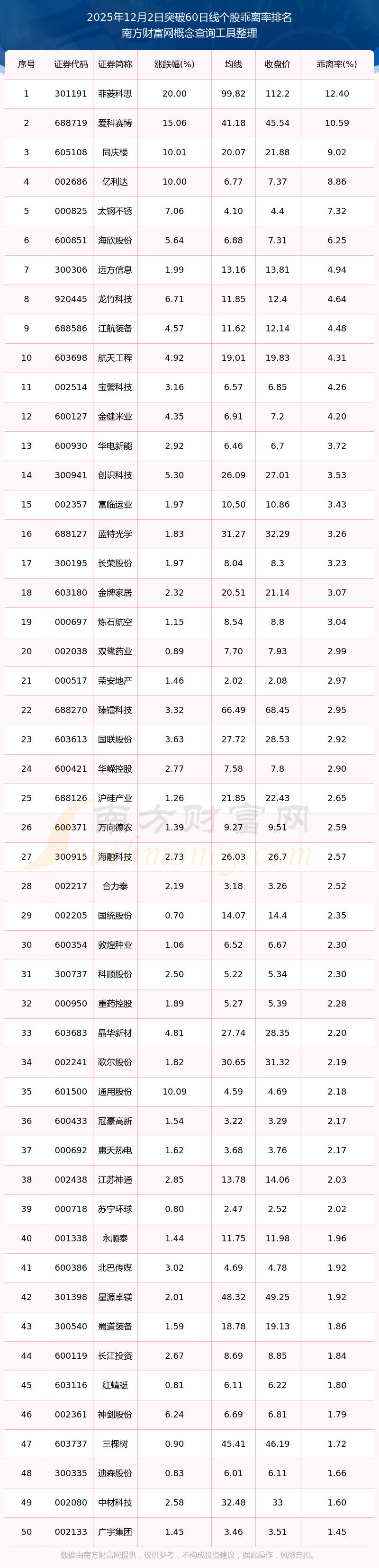 根据南方财富网概念查询工具数据统计,截止2025年12月2日收盘,共有96只个股收盘价向上突破了60日线,其中乖离率较大的个股有菲菱科思、爱科赛博、同庆楼、亿利达、太钢不锈等,乖离率分别为12.40%、10.59%、9.02%、8.86%、7.32%。