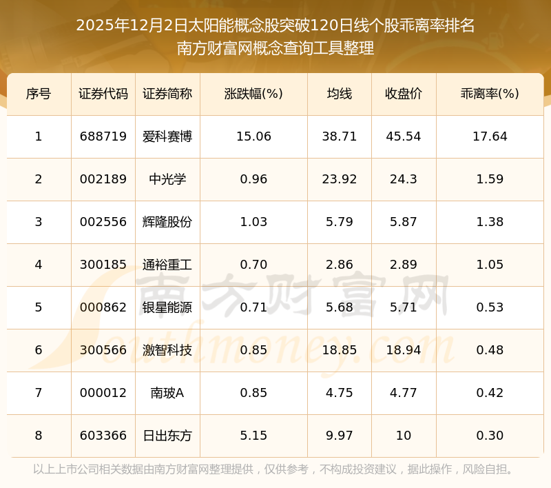根据南方财富网概念查询工具数据统计,截止2025年12月2日收盘,太阳能概念股共有8只个股收盘价向上突破了120日线。其中乖离率较大的个股有爱科赛博、中光学、辉隆股份等,乖离率分别为17.64%、1.59%、1.38%。