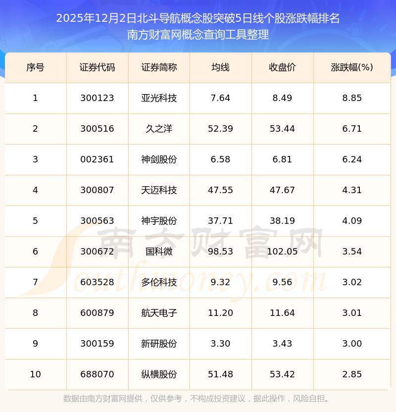根据南方财富网概念查询工具数据统计,截止2025年12月2日收盘,北斗导航概念股共有17只个股收盘价向上突破了5日线。其中涨幅较大的个股有亚光科技、久之洋、神剑股份等,涨幅分别为8.85%、6.71%、6.24%。