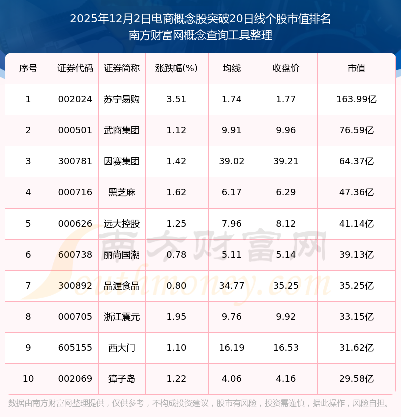根据南方财富网概念查询工具数据统计,截止2025年12月2日收盘,电商概念股共有12只个股收盘价向上突破了20日线。其中市值较大的个股有苏宁易购、武商集团、因赛集团等,市值分别为163.99亿、76.59亿、64.37亿。