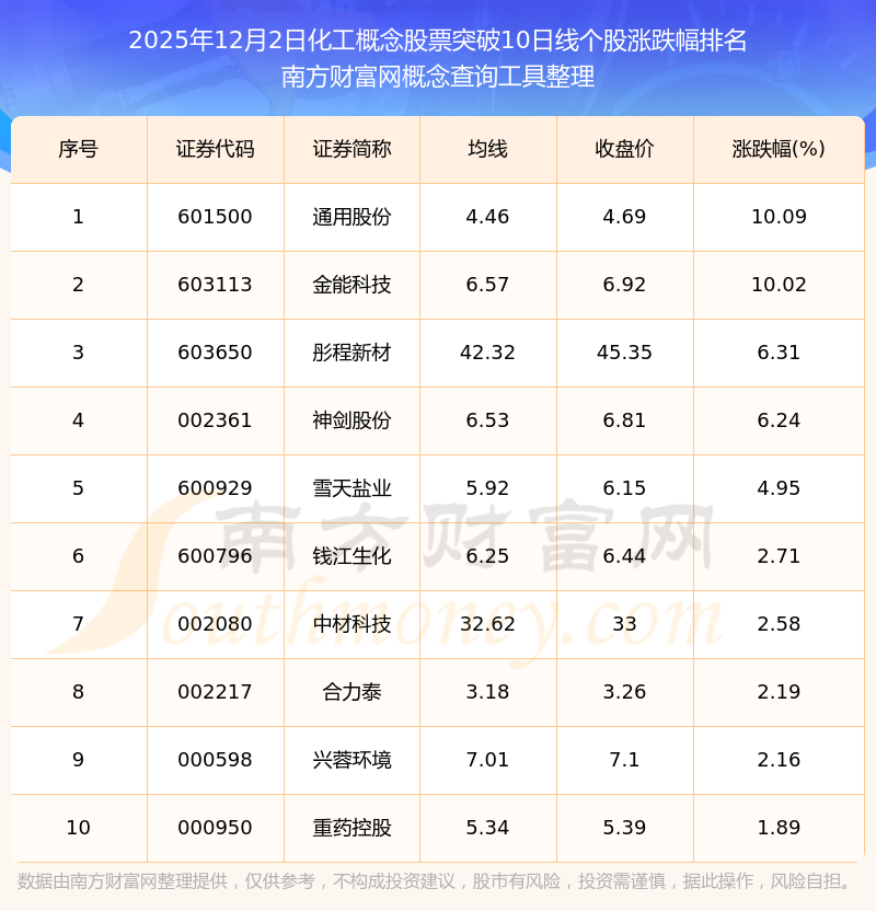 2025年12月2日化工概念股票突破10日线个股涨跌幅排名