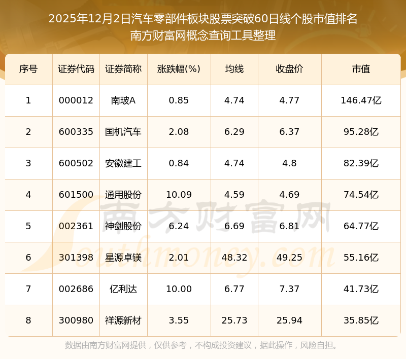 根据南方财富网概念查询工具数据统计,截止2025年12月2日收盘,汽车零部件板块股票共有8只个股收盘价向上突破了60日线。其中市值较大的个股有南玻A、国机汽车、安徽建工等,市值分别为146.47亿、95.28亿、82.39亿。