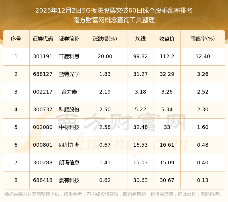 根据南方财富网概念查询工具数据统计,截止2025年12月2日收盘,5G板块股票共有8只个股收盘价向上突破了60日线。其中乖离率较大的个股有菲菱科思、蓝特光学、合力泰等,乖离率分别为12.40%、3.26%、2.52%。