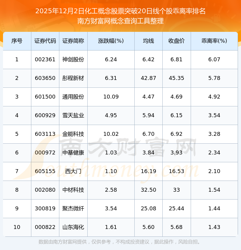 根据南方财富网概念查询工具数据统计,截止2025年12月2日收盘,化工概念股票共有14只个股收盘价向上突破了20日线。其中乖离率较大的个股有神剑股份、彤程新材、通用股份等,乖离率分别为6.07%、5.78%、4.92%。