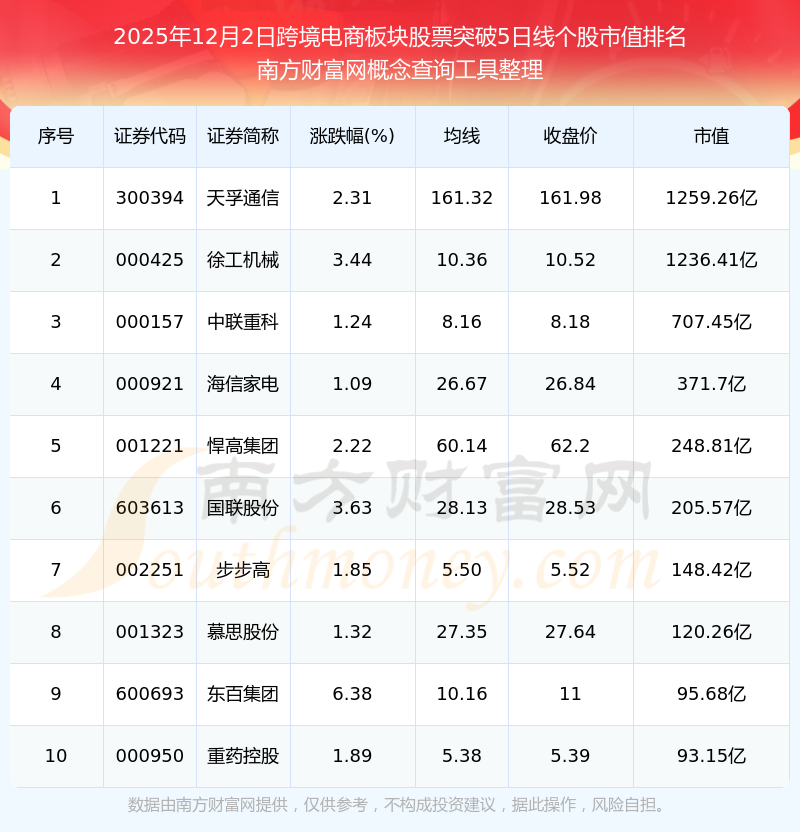 2025年12月2日跨境电商板块股票突破5日线个股市值排名
