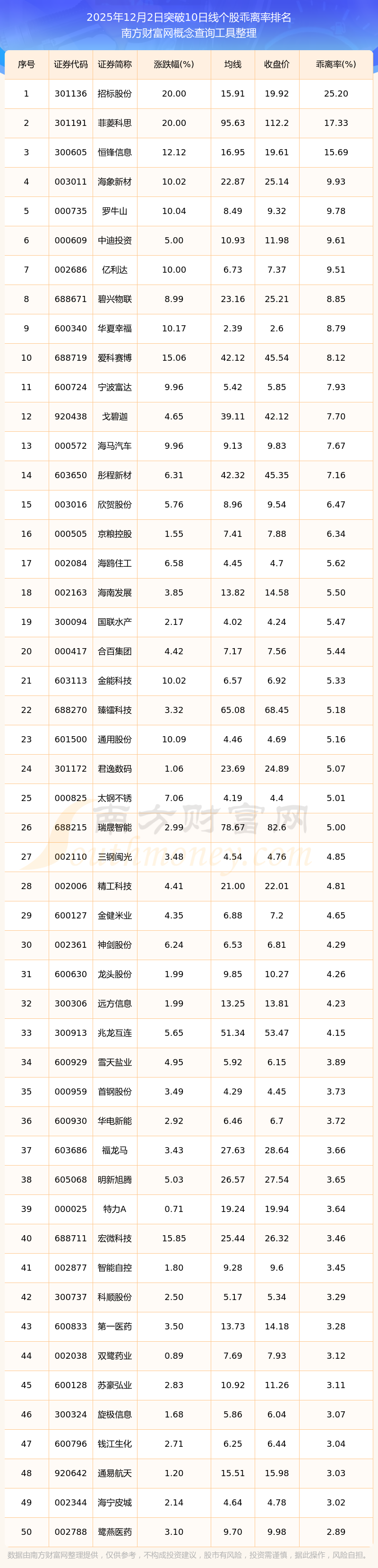 根据南方财富网概念查询工具数据统计,截止2025年12月2日收盘,共有194只个股收盘价向上突破了10日线,其中乖离率较大的个股有招标股份、菲菱科思、恒锋信息、海象新材、罗牛山等,乖离率分别为25.20%、17.33%、15.69%、9.93%、9.78%。