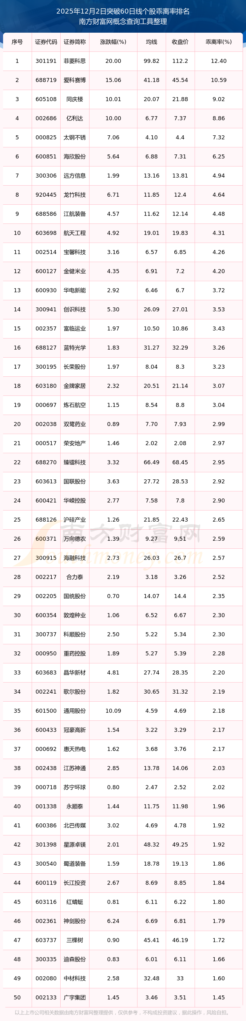 根据南方财富网概念查询工具数据统计,截止2025年12月2日收盘,共有96只个股收盘价向上突破了60日线,其中乖离率较大的个股有菲菱科思、爱科赛博、同庆楼、亿利达、太钢不锈等,乖离率分别为12.40%、10.59%、9.02%、8.86%、7.32%。