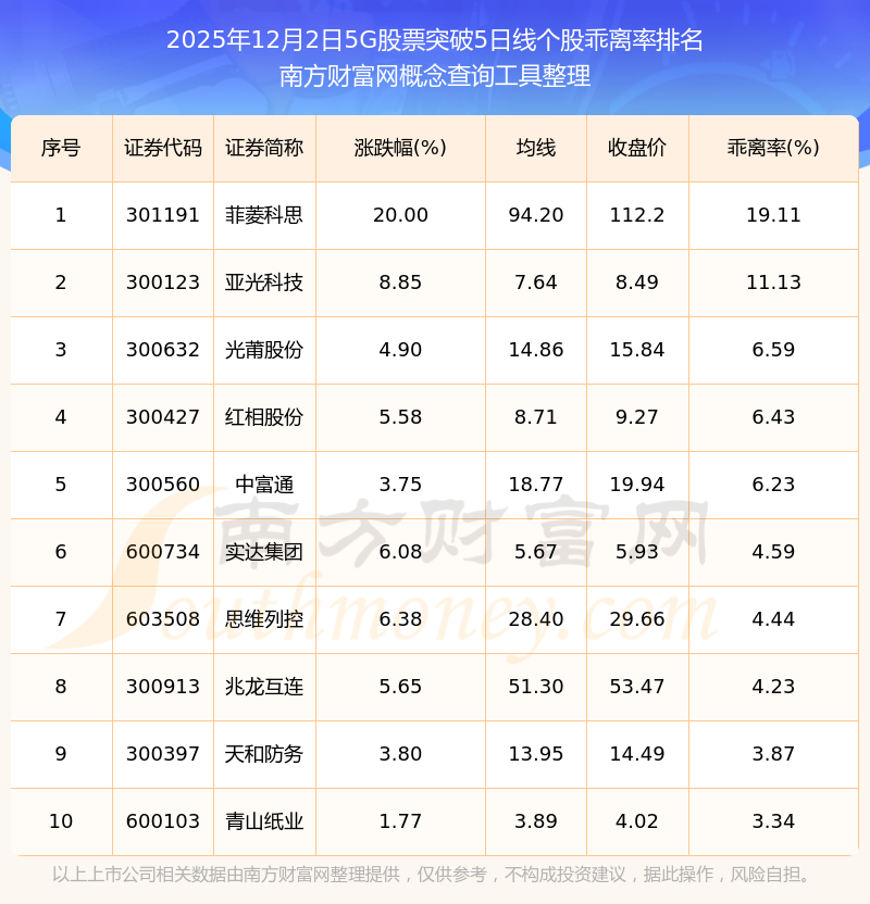 根据南方财富网概念查询工具数据统计,截止2025年12月2日收盘,5G股票共有31只个股收盘价向上突破了5日线。其中乖离率较大的个股有菲菱科思、亚光科技、光莆股份等,乖离率分别为19.11%、11.13%、6.59%。