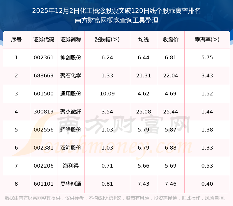 根据南方财富网概念查询工具数据统计,截止2025年12月2日收盘,化工概念股票共有8只个股收盘价向上突破了120日线。其中乖离率较大的个股有神剑股份、聚石化学、通用股份等,乖离率分别为5.75%、3.43%、1.52%。