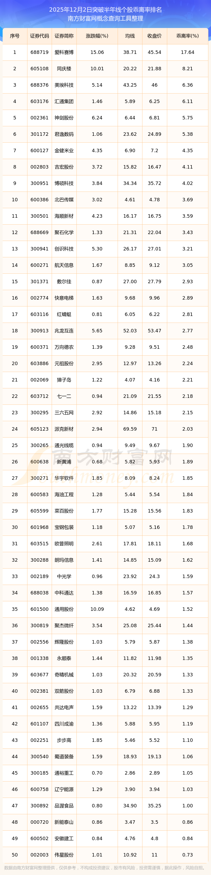 2025年12月2日突破半年线个股乖离率排名