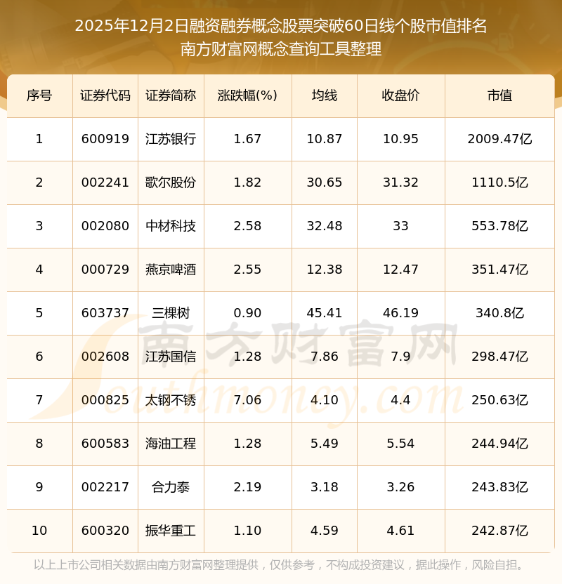 根据南方财富网概念查询工具数据统计,截止2025年12月2日收盘,融资融券概念股票共有35只个股收盘价向上突破了60日线。其中市值较大的个股有江苏银行、歌尔股份、中材科技等,市值分别为2009.47亿、1110.5亿、553.78亿。