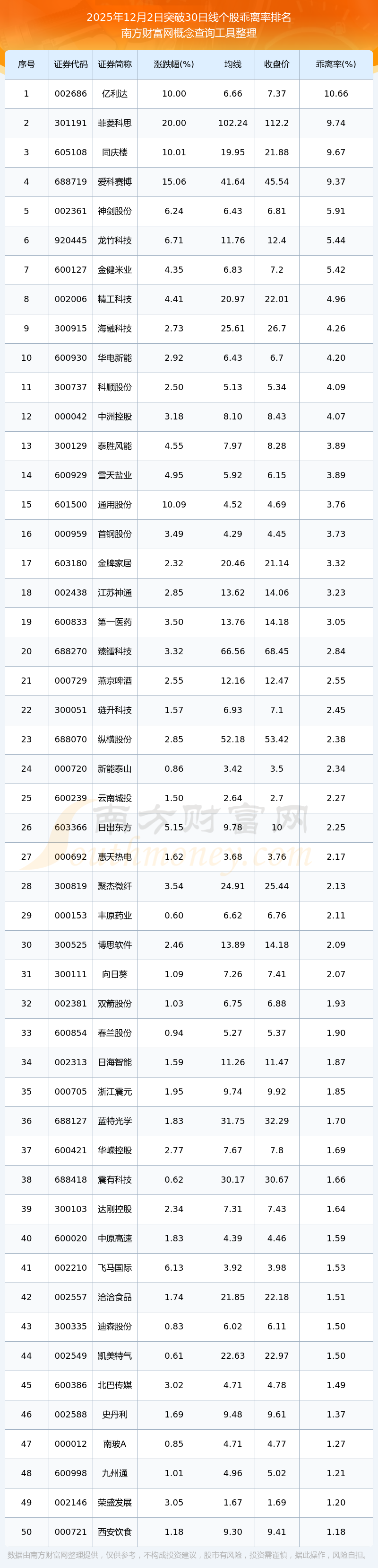 根据南方财富网概念查询工具数据统计,截止2025年12月2日收盘,共有84只个股收盘价向上突破了30日线,其中乖离率较大的个股有亿利达、菲菱科思、同庆楼、爱科赛博、神剑股份等,乖离率分别为10.66%、9.74%、9.67%、9.37%、5.91%。