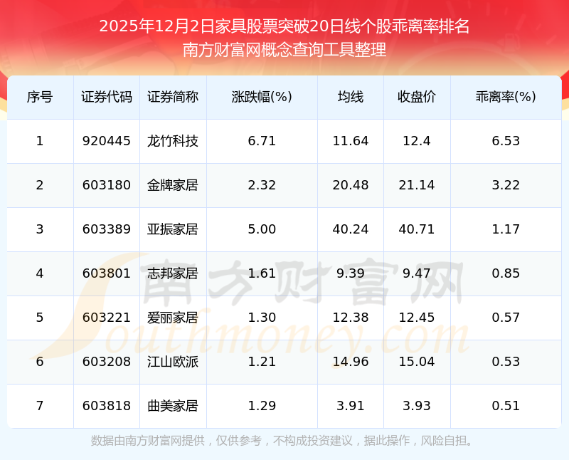 2025年12月2日家具股票突破20日线个股乖离率排名