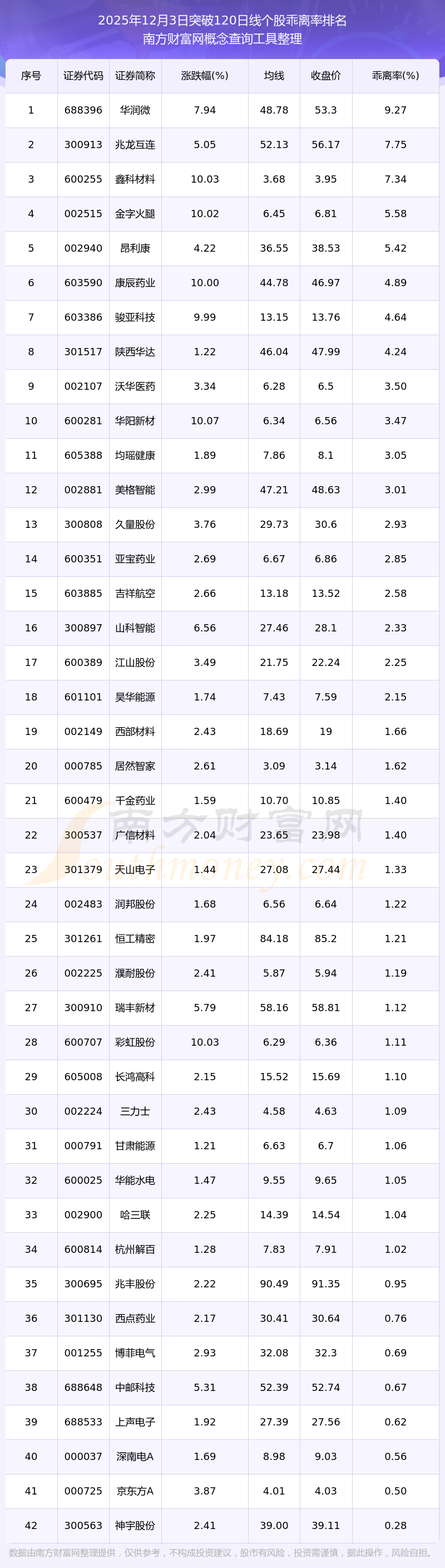 2025年12月3日突破120日线个股乖离率排名