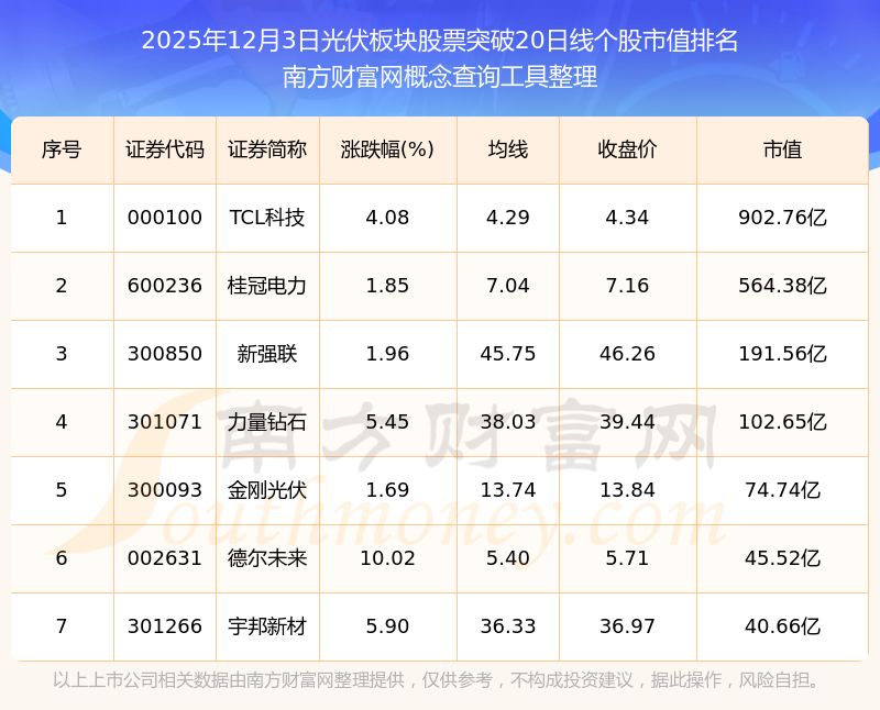 根据南方财富网概念查询工具数据统计,截止2025年12月3日收盘,光伏板块股票共有7只个股收盘价向上突破了20日线。其中市值较大的个股有TCL科技、桂冠电力、新强联等,市值分别为902.76亿、564.38亿、191.56亿。