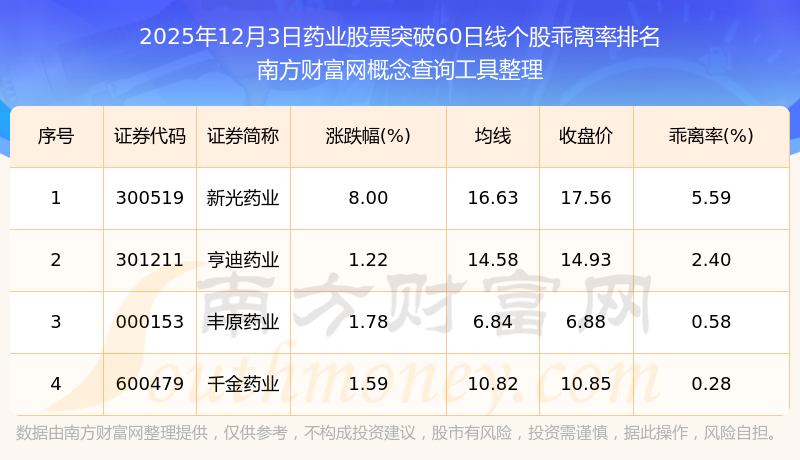 根据南方财富网概念查询工具数据统计,截止2025年12月3日收盘,药业股票共有4只个股收盘价向上突破了60日线。其中乖离率较大的个股有新光药业、亨迪药业、丰原药业等,乖离率分别为5.59%、2.40%、0.58%。