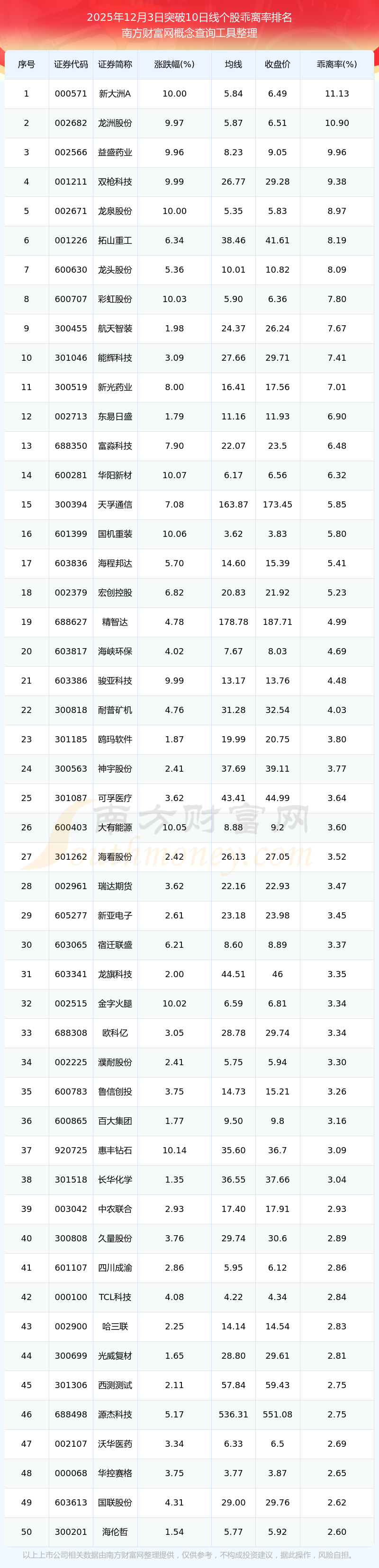 根据南方财富网概念查询工具数据统计,截止2025年12月3日收盘,共有107只个股收盘价向上突破了10日线,其中乖离率较大的个股有新大洲A、龙洲股份、益盛药业、双枪科技、龙泉股份等,乖离率分别为11.13%、10.90%、9.96%、9.38%、8.97%。