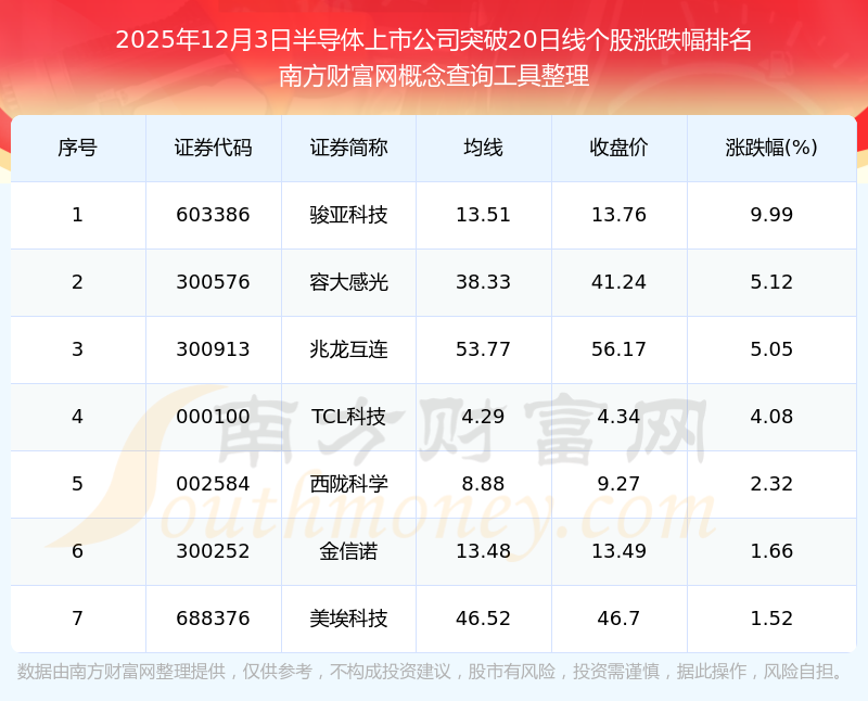 根据南方财富网概念查询工具数据统计,截止2025年12月3日收盘,半导体上市公司共有7只个股收盘价向上突破了20日线。其中涨幅较大的个股有骏亚科技、容大感光、兆龙互连等,涨幅分别为9.99%、5.12%、5.05%。