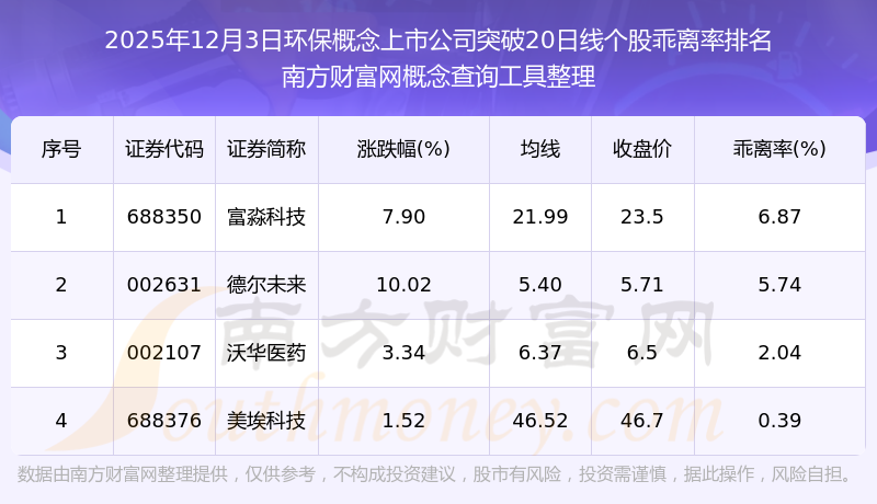 根据南方财富网概念查询工具数据统计,截止2025年12月3日收盘,环保概念上市公司共有4只个股收盘价向上突破了20日线。其中乖离率较大的个股有富淼科技、德尔未来、沃华医药等,乖离率分别为6.87%、5.74%、2.04%。